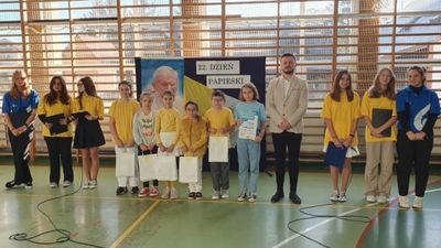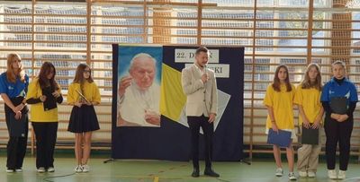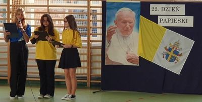 W poniedziałek 17 października w naszej szkole obchodziliśmy 22. Dzień Papieski. Był to szczególny akcent wyrażenia wdzięczności i pamięci za dzieło naszego Wielkiego Rodaka Św. Jana Pawła II. W tym roku przypadała bowiem 44. rocznica wyboru kard. Karola Józefa Wojtyły na Stolicę Piotrową. Uczennice z klasy VIII w okolicznościowym apelu przypomniały w skrócie Jego życie i zachęciły do zapamiętania kilku ważnych słów, które kierował On do ludzi - szczególnie młodych całego świata. A jakie to wyjątkowe słowa? Wspomnijmy: