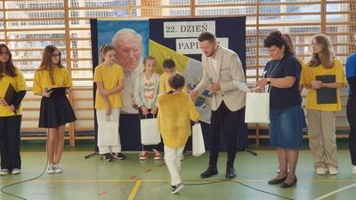 Na zakończenie apelu Pan Dyrektor podzielił się z nami swoimi wspomnieniami ze spotkania z Ojcem Świętym i zachęcił do częstego czytania Jego biografii, korzystania z Jego nauczania i naśladowania Go w swoim życiu. Wręczył również nagrody laureatom gminnego konkursu plastycznego "Pocztówka z wakacji".