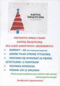 Zachęcamy również do przygotowania pięknych kartek bożonarodzeniowych, które przekażemy do Caritas Kraków, która organizować będzie na krakowskim rynku wigilię dla bezdomnych i samotnych. Akcja trwa w naszej szkole do 12 grudnia.