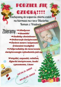 Zimowa aura nastraja nas świątecznie. Nasze myśli biegną powoli do zbliżających się Świąt. Wraz z nimi organizowane są kiermasze i wigilie dla ludzi bezdomnych i samotnych. Pragniemy zachęcić wszystkich do włączenia się w akcję pomocy dla Oliwierka, by przygotować wraz z Wolontariuszami z Wadowic kiermasz charytatywny. Co należy przynieść - informacje na dołączonym plakacie. Materiały gromadzimy w szkole do 9 grudnia.