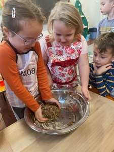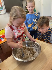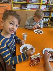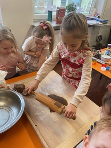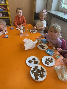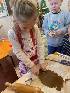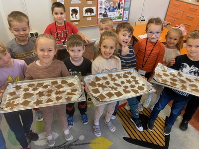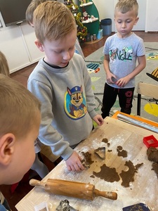 Święta tuż tuż, więc w naszej grupie nadszedł czas na pieczenie i dekorowanie świątecznych pierniczków. Najpierw Sówki poznały składniki i sposób wykonania ciasta, a następnie po dokładnym umyciu rąk dzieci ochoczo zabrały się do pracy. Z przygotowanego przez nich ciasta, wykrawały foremkami w świątecznych kształtach pyszne ciasteczka. Następnie pierniczki zostały upieczone. Wspaniały zapach unosił się w naszej sali i wprawił wszystkich w świąteczny nastrój. Następnie dzieci zajęły się dekorowaniem upieczonych pierników. Przedszkolaki bardzo poważnie podeszły do tematu i z zaangażowaniem ozdabiały ciastka lukrami oraz różnymi posypkami. Piękne, własnoręcznie udekorowane smakołyki dzieci zabrały do domów, aby obdarować nimi swoich najbliższych.