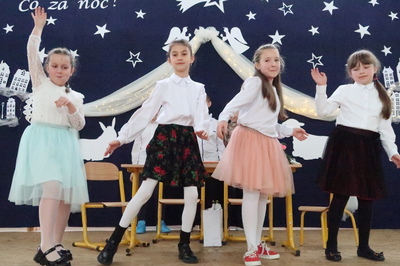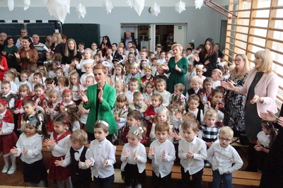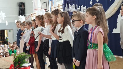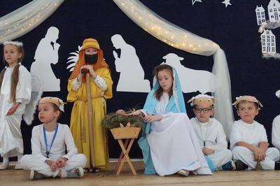 Pięknie wyglądała udekorowana sala i scena, na której odbyły się nasze aktorskie popisy. W tym roku Jasełka pt. "Ach! Co za noc!" przygotowały 6-latki z grupy "Sówki" w które wplecione były pastorałki wykonane przez dzieci z grup młodszych 3, 4 i 5 - latków. Następnie na scenie pojawiły się dzieci z klas I-III recytując wierszyki dla babć i dziadków, śpiewając piosenki oraz przedstawiły krótką inscenizację. Na zakończenie wszystkie dzieci zaśpiewały „ Sto lat” swoim Babciom i Dziadkom. Po występach przedszkolaków i uczniów klas I-III odbyło się wspólne kolędowanie z zespołem „Karmelki”. Obecni goście chętnie włączyli się w śpiew kolęd. Po kolędowaniu wszystkie dzieci swoim Babciom i Dziadkom złożyły życzenia wręczając wcześniej przygotowane upominki.