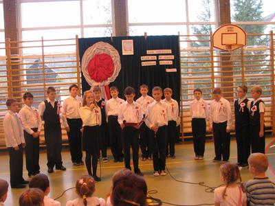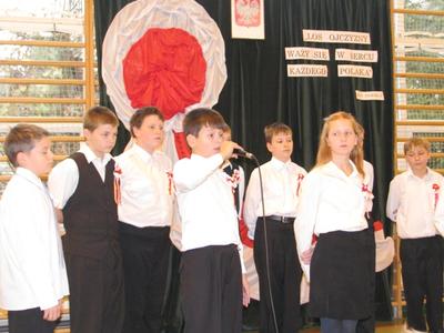 W całym dzisiejszym dniu na różnych lekcjach przejawiała się tematyka patriotyczna. Zewnętrzny strój galowy, przypięte kotyliony w barwach narodowych i gazetki ścienne wzmacniały w nas atmosferę świąteczną, a nade wszystko patriotyczną.