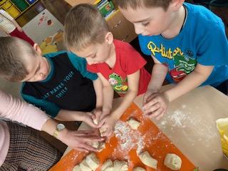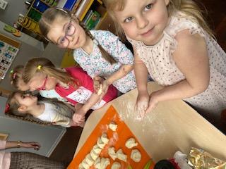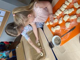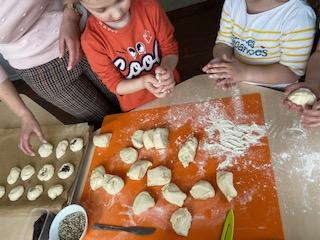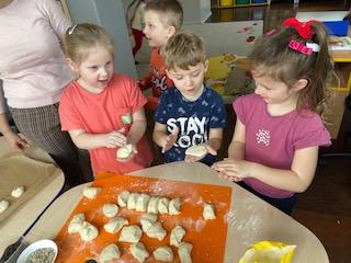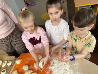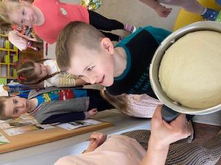 Celem zajęć, które odbyły się dn. 20.04.2023r. było zapoznanie dzieci z kolejnymi etapami produkcji chleba, uświadomienie dzieciom, że chleb jest symbolem ciężkiej pracy wielu ludzi: rolnika, młynarza i piekarza. Dzieci wysłuchały opowiadania przy ilustracjach. Wiedzą już, że rolnik sieje i zbiera ziarna z pola, potem zawozi je do młyna. Młynarz miele zboże na mąkę, a piekarz wyrabia ciasto z maki soli, wody i drożdży. Chleb wypieka w gorącym piecu. Świeże pieczywo rozwozi się do sklepów. Dzieci poznały maszyny i urządzenia, które znajdują się w piekarni oraz cały proces produkcji na podstawie filmu edukacyjnego. Na zajęciach miały okazję nie tylko obserwować, ale również czynnie uczestniczyć. Dzieci z grupy Lisków wcieliły się w rolę piekarzy - samodzielnie lepiły bułeczki posypujać je wybranymi ziarenkami. Poznały składniki, z jakich powstaje pieczywo. Probowanie upieczonych przysmaków sprawiło przedszkolakom całe mnóstwo radości!