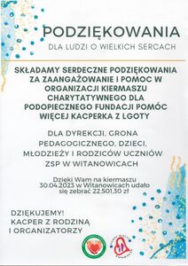 W ostatnim tygodniu kwietnia Szkolne Koło Caritas wraz z Fundacją "Pomóc Więcej" z Kleczy zorganizowało akcję charytatywną "Pomoc dla Kacperka" - ucznia naszej szkoły. Do pomocy włączyła się cała nasza społeczność szkolna wraz z Rodzicami, Nauczycielami i Dyrekcją. Zbieraliśmy fanty typu: pluszaki, gry planszowe, przybory szkolne, rękodzieło i inne atrakcyjne przedmioty w bardzo dobrym stanie, które można było przekazać na organizowaną akcję. Oczywiście nasi Rodzice również upiekli pyszne ciasta i ciasteczka, które stały się nieodzownym punktem sprzedaży podczas organizowanych kiermaszy. W sobotę 29 kwietnia przewieźliśmy nasze dary do Lgoty, by w budynku starej szkoły pomóc w przygotowaniu paczek. W niedzielę 30 kwietnia 2023 r. przy parafialnym kościele w Witanowicach odbył się kiermasz zorganizowany w ramach Ogólnopolskiego Dnia Dobra - jako ogólnopolska akcja Caritas. Nasi Wolontariusze czynnie uczestniczyli w pomocy, pełniąc dyżury w wyznaczonych godzinach. Akcję pilotowała Fundacja "Pomóc Więcej", która przesłała podziękowanie za zaangażowanie naszej Szkoły w przeprowadzoną pomoc Kacperkowi - podopiecznemu Fundacji. Słowa wdzięczności zostały przekazane wszystkich podczas apelu papieskiego w piątek 19 kwietnia. Mamy nadzieję, że Kacperek skorzysta z naszej pomocy i będzie wracał do zdrowia.