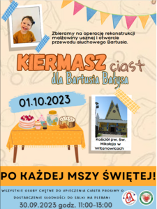 Stowarzyszenie "Głos Miłosierdzia" ze Spytkowic zwraca się do nas z prośbą o wsparcie dla 2,5 letniego Bartusia Bałysa z Bachowic, który urodził się bez uszka lewego, dlatego cierpi na głęboki niedosłuch. Szansą na powrót do zdrowia jest operacja rekonstrukcji ucha i otwarcia przewodu słuchowego. Koszt operacji został wyceniony na kwotę 150 tysięcy dolarów. Dlatego prosimy chętnych wolontariuszy i rodziców o upieczenie ciasta lub ciasteczek, które będą wystawione na sprzedaż w trakcie kiermaszu przy kościele w Witanowicach w niedzielę 1 października po Mszach Świętych. Ciasto należy przynosić na starą plebanię w sobotę 30 września w godzinach od 11.00 do 13.00.