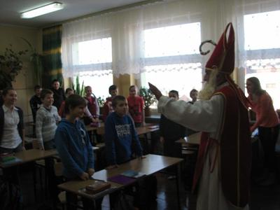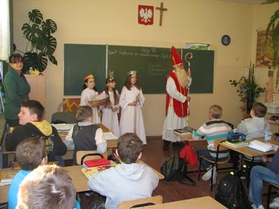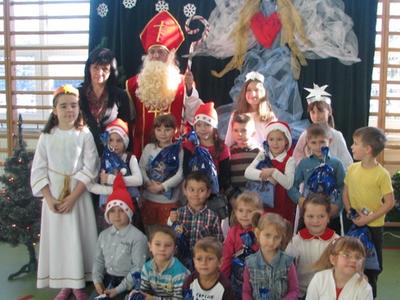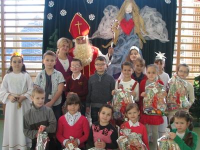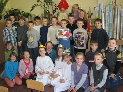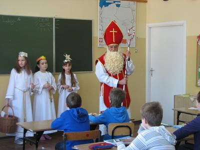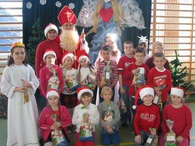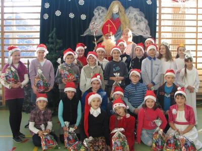 Słowami tej piosenki powitaliśmy Św. Mikołaja w naszym szkolnym gronie. Wczesnym rankiem długo oczekiwany Gość, jak to w Jego stylu bywa, zaskoczył swą obecnością najstarsze klasy naszej szkoły. W miłej atmosferze, w obecności wychowawców i Aniołów przebiegało spotkanie w klasach. Św. Mikołaj wręczył słodkie upominki, a także zaproszenie do kina na wybrany film. Szczególnym zaskoczeniem była ta wiadomość dla Szóstoklasistów, którzy nic wcześniej na ten temat nie wiedzieli, a seans filmowy rozpoczynał się dla nich w Wadowicach już za 90 minut. Radość z takiego prezentu tym bardziej była wielka. Następnie Św. Mikołaj udał się na spotkanie klas 0 - III, które oczekiwały Go w sali gimnastycznej. Rozśpiewane dzieciaki z ogromną radością przywitały piosenkami i wierszami Gościa z Nieba. On również wygłosił do dzieci kilka ważnych słów, podkreślając, że z Nieba śledzi na bieżąco co się u nas dzieje, a także wspomniał, że zerka na naszą stronę www, co niektórych bardzo zaskoczyło. I wreszcie nastał czas rozdawania prezentów. Okazało się, że nikt nie dostał rózgi, a uśmiechnięte buźki dzieci były radością Św. Mikołaja. Dalsza trasa wędrówki zaprowadziła Św. Mikołaja do najmłodszych przedszkolaczków, a więc do dzieci 3 - 4 letnich. Oj, tu Św. Mikołaj musiał uzbroić się w cierpliwość, gdyż dzieciaczki chciały Mu wiele, wiele, ważnych rzeczy powiedzieć. Zadawały trudne pytania, ale też śpiewały, recytowały wiersze, a nawet tańczyły dla Mikołaja. I tak szybko minął radosny czas spotkania ze Św. Mikołajem w murach naszej szkoły. Podziękowaliśmy serdecznie za wszyskie cenne prezenty oraz zaprosiliśmy Go na przyszły rok. Św. Mikołaj chętnie zostałby u nas dłużej, lecz jak wiecie, inne dzieci też na Niego czekały. Zrozumieliśmy to i staraliśmy się być wyrozumiali.