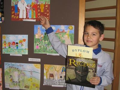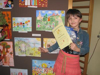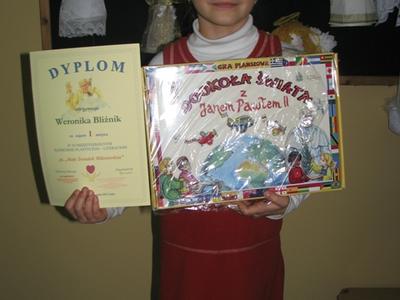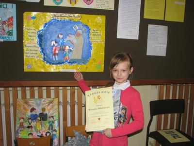 Jury wybrało spośród tych prac 10 najlepszych /tyle można było przesłać dalej/ i przekazało do komisji konkursowej. Było to zadanie bardzo trudne, gdyż każda praca była przemyślana i wykonana bardzo starannie.Z radością przyjęliśmy informację, iż aż 5 prac z naszej szkoły zostało wyróżnionych spośród ponad 100, które wpłynęły do Szkoły w Babicy. Wyróżnione prace wykonane były przez: Tomasza Błażowskiego /6-latek/, Weronikę Mikołajczyk /kl. II/, Patryka Krańskiego /kl. III/, Justynę Russek /kl. III/, Weronikę Bliźnik /kl. III/ - praca literacka, która zdobyła I miejsce. Wymienieni uczniowie otrzymali pamiątkowe dyplomy i cenne nagrody rzeczowe, których sponsorem byli: Burmistrz Wadowic Pani Ewa Filipiak i Ks. Kan. Józef Wróbel. Również wszyscy opiekunowie uczniów, którzy nadesłali prace otrzymali kalendarze ścienne oraz pamiątkowe podziękowania za włożony trud w przygotowanie dzieci do konkursu.