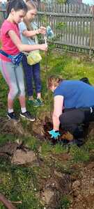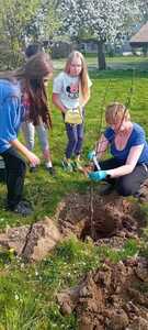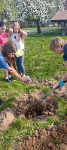 W sobotę 13 kwietnia nasi "Dzielni Sadownicy" ponownie wybrali się do ogrodu Pani Bożenki. Tym razem były to bardzo praktyczne zajęcia, których celem była nauka prawidłowego sadzenia drzew. Pani Bożenka w tym dniu sadziła w swoim ogrodzie dwie odmiany starych gatunków śliw. Chętnie skorzystaliśmy z zaproszenia i przyszliśmy podlądnąć jak ona to robi. A było naprawdę warto. Sadownik opowiedział nam o odpowiednim przygotowaniu podłoża w dole, w którym wsadzimy drzewko. Oczywiście potrzebny tu jest odpowiedni nawóz naturalny - obornik lub kompostownik; dobra sypka gleba i dużo wody. Wraz z Panią Bożenką wsadziliśmy piękne dwa drzewa. Najbardziej zdziwiło nas to, że do zasadzenia potrzebna jest duża ilość wody. Do każdego z drzew wlaliśmy aż 12 l wody. Dowiedzieliśmy się również w jaki sposób pociąć korzenie, i jak wsadzić drzewko, by mogło swobonie oddychać tenem - co jest bardzo ważne. Teraz będziemy zaglądać do ogrodu Pani Bożenki, by podziwiać wzrost nowych drzewek. Zachęcamy również do posadzenia w swoich ogórdkach starych gatunków jabłoni i skorzystania z poradnika sadownika umieszconego na stronie Tradycyjny Sad pod linkiem https://tradycyjnysad.pl/zabiegi-agrotechniczne/https://tradycyjnysad.pl/zabiegi-agrotechniczne/