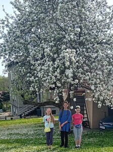 Nie powstrzymaliśmy się w tym dniu od zrobienia sobie zdjęcia przy pięknie kwitnącej jabłoni, która rośnie tu w ogrodzie ponad 40 lat. Widok robi ona przepiękny!!!