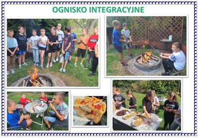 Dalsza część naszej wyprawy odbyła się wokół ogniska. Tu oczywiście mogliśmy samodzielnie upiec kiełbaski - co nie było takie łatwe. Jednak najważniejsze były zabawy integracyjne, wśród których królowała zabawa w chowanego i gra w siatkówkę. Był to cenny czas, podczas którego odbudowaliśmy nowe przyjazne relacje i podzieliliśmy się wspomnieniami z wakacji. Mogliśmy lepiej poznać nowych naszych rówieśników: Vanessę i Krystiana, których witamy w naszej grupie klasowej. Niezawodni Rodzice przygotowali nam prawdziwą ucztę, zastawiając ogrodowy stoliczek pysznościami, wśród których nie mogło zabraknąć smacznej pizzy i pysznych naturalnych soków z tegorocznych owoców - za co Im serdecznie dziękujemy:)