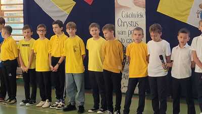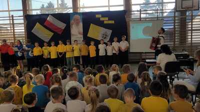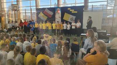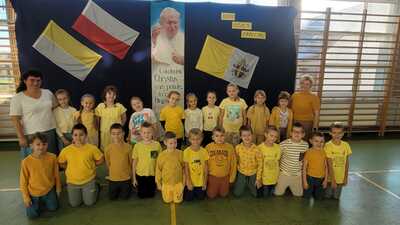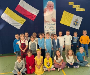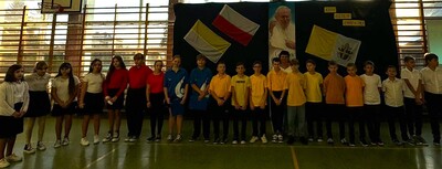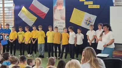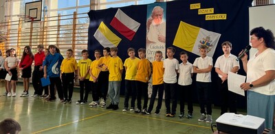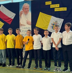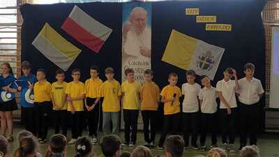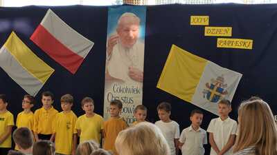 Corocznie w naszej szkole uroczyście obchodzimy Dzień Papieski. Tym razem przeżywaliśmy go w środę 16 października - w 46. rocznicę wyboru kard. Karola Wojtyły na Papieża. Hasłem tego dnia były słowa: "Jan Paweł II. Ewangelia starości i cierpienia." W klimat świętowania wprowadzili nas uczniowie klasy V, którzy pod przewodnictwem wychowawczyni przygotowali okolicznościowy apel. Miło było posłuchać wspomnień o życiu św. Jana Pawła II oraz okolicznościowych piosenek, wśród których był rap "Lolek" oraz "Góralu, czy Ci nie żal?...". Świętowanie w szkole podkreśliliśmy kolorami papieskimi oraz okolicznościowymi gazetkami ściennymi. Radośnie z naszych ust słychać było śpiew Barki. Nasi wolontariusze ze SKC w niedzielę 13 października włączyli się w akcję Dzieło Nowego Tysiąclecia przy kościele parafialnym w Witanowicach. Jako uczniowie szkoły nie tylko świętujemy, ale także chcemy aktywnie budować żywy pomnik dla Św. Jana Pawła II. Czynimy to przez akcje charytatywne, w które aktywnie się włączamy, pomagając ludziom potrzebującym. Już od poniedziałku 21 października zachęcamy do wsparcia dzieci z Lewina Brzeskiego, których szkoła i świetlica całkowicie została zniszczona podczas tegorocznej powodzi. Szczegóły na plakacie.