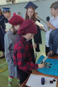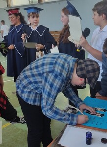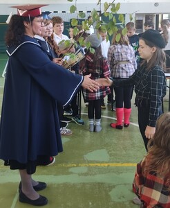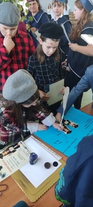 Nad całością obrzędu czuwała w tym roku Kapituła, którą tworzyli Żacy z kl. V: Milena, Grzegorz, Lena i wychowawca p. Edyta. By wszyscy dobrze się bawili, Żacy zaprosili do wspólnej zabawy - pociąg do ZSP w Witanowicach. Po zatrzymaniu się na docelowej stacji rozpoczęły się zabawy. Czwartoklasiści musieli wykazać się sprawnością fizyczną jak również wiedzą na temat naszej szkoły. Każdy, kto przeszedł pomyślnie ten etap sprawnościowy, został naznaczony "piegami mądrości". Jeśli komuś się nie udało, musiał zaliczyć zadanie dodatkowe, którym najczęściej było zjedzenie plastra cytryny bez grymasu na twarzy. Następnie uczniowie złożyli uroczyste ślubowanie, w którym podkreślili, że będą się solidnie uczyć, a swoim zachowaniem i współpracą z innymi Żakami będą przynosić chlubę naszej szacownej Alma Mater czyli Szkole. Dokument ten uroczyście podpisali gęsim piórem - co nie było takie łatwe. I wreszcie obrzęd pasowania na Żaka, dokonany gałęzią lipy z Czarnolasu. Na zakończenie Czwartoklasiści otrzymali pamiątkowe dyplomy i upominki od Piątoklasistów, którzy przygotowali całość uroczystości otrzęsin, angażując się bardzo odpowiedzialnie we wszystkie konkurencje.