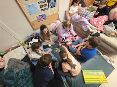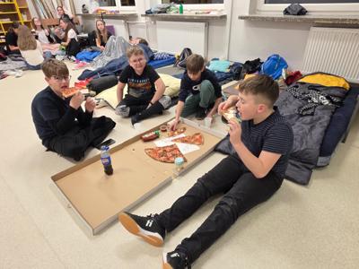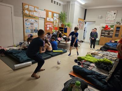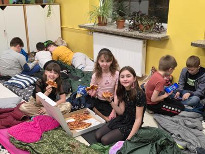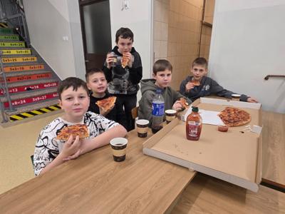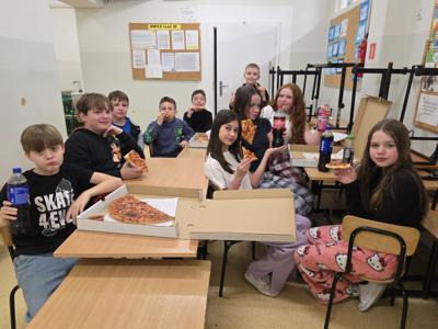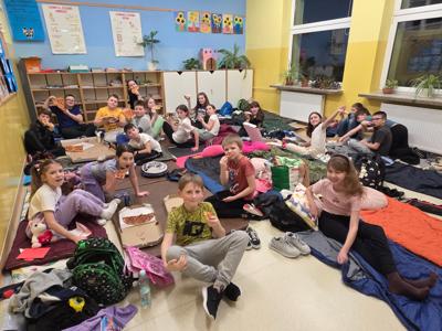 Tak, szczególna noc, gdyż długo oczekiwana przez uczniów naszej szkoły. Z piątku na sobotę, tj. z 14 na 15 lutego 2025 r. uczniowie klas IV - VIII mogli spędzić tę noc w murach swojej szkoły. Nic więc dziwnego, że skorzystało z tej możliwości wielu uczniów. Zgromadziliśmy się na sali gimnastycznej o godz. 20.00, by tu pod okiem wychowawców rozpocząć wyjątkową noc. Zakwaterowaliśmy się w naszych salach, a to troszkę potrwało. Następnie w znakomitych humorach rozpoczęliśmy wspaniałą zabawę. Były tańce, wspólne oglądanie filmów, gry planszowe i zespołowe... Lecz najważniesze - to nasze dłuuuuuuugie rozmowy - aż do rana. Oczywiście nie mogło zabraknąć pizzy, która tej nocy wyjątkowo smakowała. I tak, w znakomitych nastrojach doczekaliśmy sobotniego ranka. Trochę zaspani, ale pełni werwy, zabraliśmy się do sprzątania, by o godz. 6.00 opuścić szkołę i powrócić do domów.