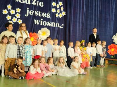 Z okazji Powitania Wiosny 5 latki przygotowały przedstawienie, w którym to na początku Pani Zima chełpiła się swoją władzą nad światem. Pozostałe dzieci prosiły ją aby berło przekazała wiośnie... wołały ją śpiewając piosenki. Gdy się pojawiła, w zamian wręczyła każdej dziewczynce kwiatuszek, a chłopcom koniczynkę. Dzieci wykazały się dużym zaangażowaniem i talentem nie tylko aktorskim ale i muzycznym.