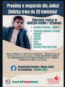 Odpowiadając na prośbę rodziców Juliana o wsparcie ich walki o samodzielność syna, w naszej szkole organizujemy zbórkę potrzebnych konkretnych rzeczy na kiermasz. Akcja trwać będzie od wtorku 1 kwietnia do piątku 4 kwietnia. Jakie konkretne dary można przynosić?