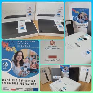 - Miło nam poinformować, że pozyskaliśmy wsparcie na zakup projektora laserowego i dwóch tabletów do oddziałów przedszkolnych. W ramach projektu nauczyciele doskonalili swoje umiejętności w cyklu szkoleń zorganizowanych przez Stowarzyszenie „Miasta w Internecie” z siedzibą w Tarnowie. Wsparcie było możliwe dzięki uczestnictwie w grancie ”Małopolska Ścieżka Rozwoju Nauczycieli Wychowania Przedszkolnego” realizowanego w ramach programu Krajowy Planu Odbudowy i Zwiększenia Odporności oraz Unii Europejskiej NextGenerationEU – szkolenie dla nauczycieli wychowania przedszkolnego, Działanie C.2.1.3 e-kompetencje finansowanego ze środków Instrumentu na Rzecz Odbudowy i Wzmacniania Odporności”.