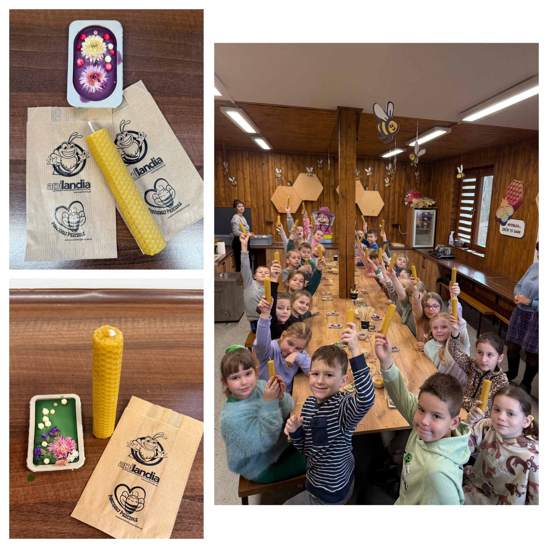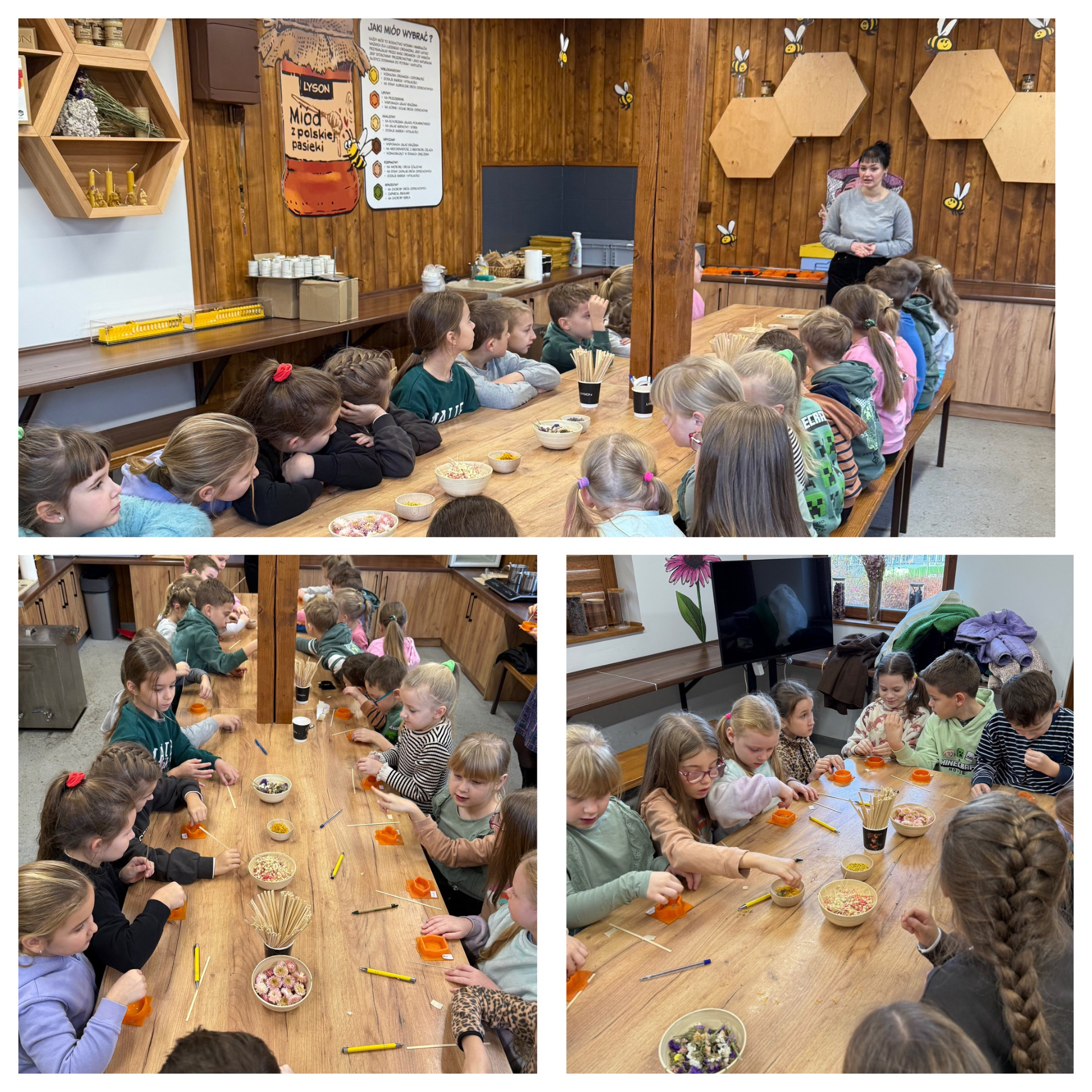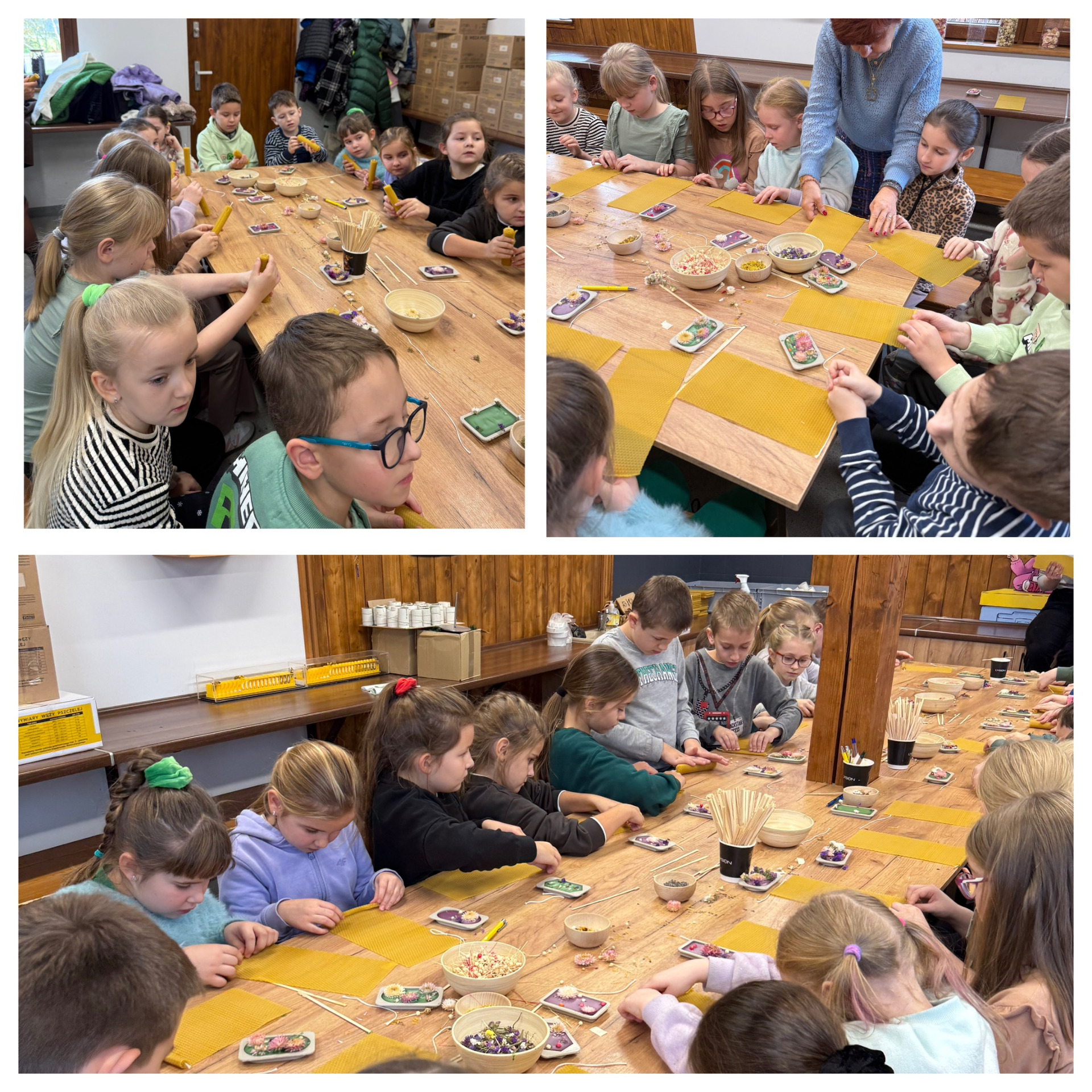 Pierwszym punktem programu były warsztaty, podczas których uczniowie własnoręcznie wykonywali świece z wosku pszczelego, woskowe tabliczki florenckie oraz pachnące mydełka. Zajęcia te dostarczyły wiele radości i satysfakcji – dzieci z dumą prezentowały swoje prace, które mogły zabrać ze sobą do domu.