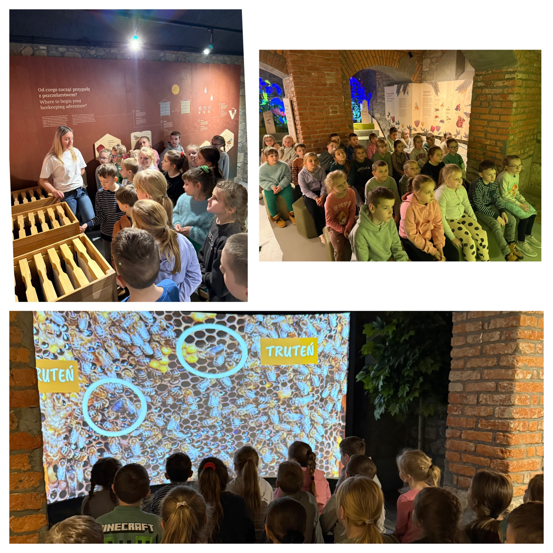 Drugim punktem programu była część edukacyjna czyli zwiedzanie interaktywnego muzeum. Pani przewodnik oprowadziła nas po czterech strefach tematycznych tego miejsca. W trakcie zwiedzania opowiadała nam o mieszkańcach ula: o królowej, robotnicach i trutniach oraz ich zwyczajach. Poznaliśmy produkty pszczelarskie – takie jak miód, pyłek, pierzga czy propolis – i dowiedzieliśmy się, jak wykorzystuje się je zarówno w kuchni, jak i w medycynie. Poznaliśmy bliżej pracę pszczelarza. Dowiedzieliśmy się, co należy do jego codziennych obowiązków, jak dba on o ule, jak chroni pszczoły przed chorobami, jakich używa narzędzi i do czego służą mu takie przedmioty jak dłuto, kapelusz czy szczotka pszczelarska. Zrozumieliśmy również, jak ważną rolę pszczoły pełnią w przyrodzie i co sami możemy zrobić, by im pomagać.
