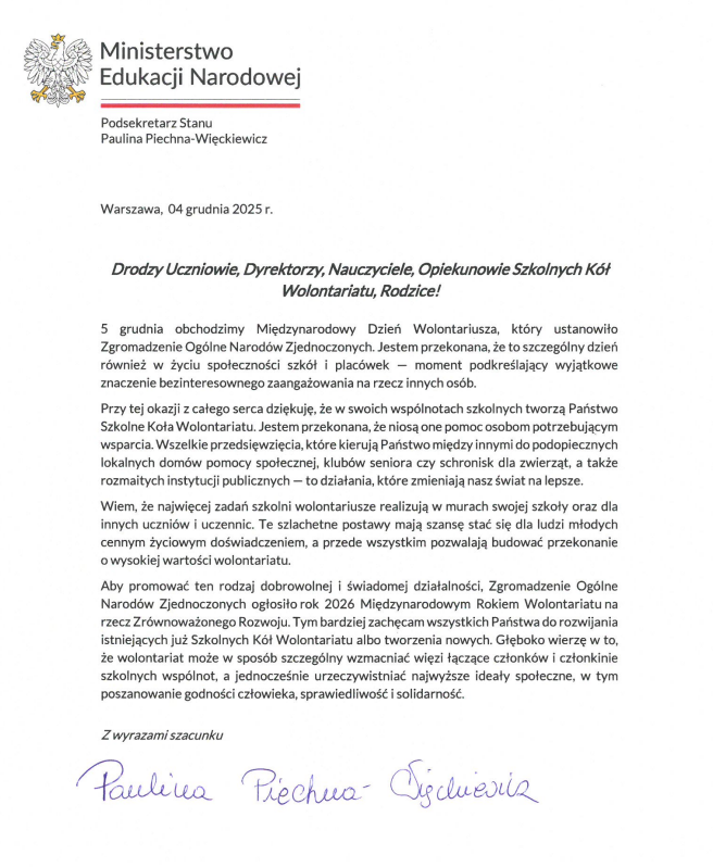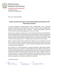 Z tej okazji przekazujemy List Pani Ministry, Pauliny Piechny-Więckiewicz w sprawie Szkolnych Kół Wolontariatu i wspierania działań uczniów w ramach wolontariatu w szkołach i placówkach.