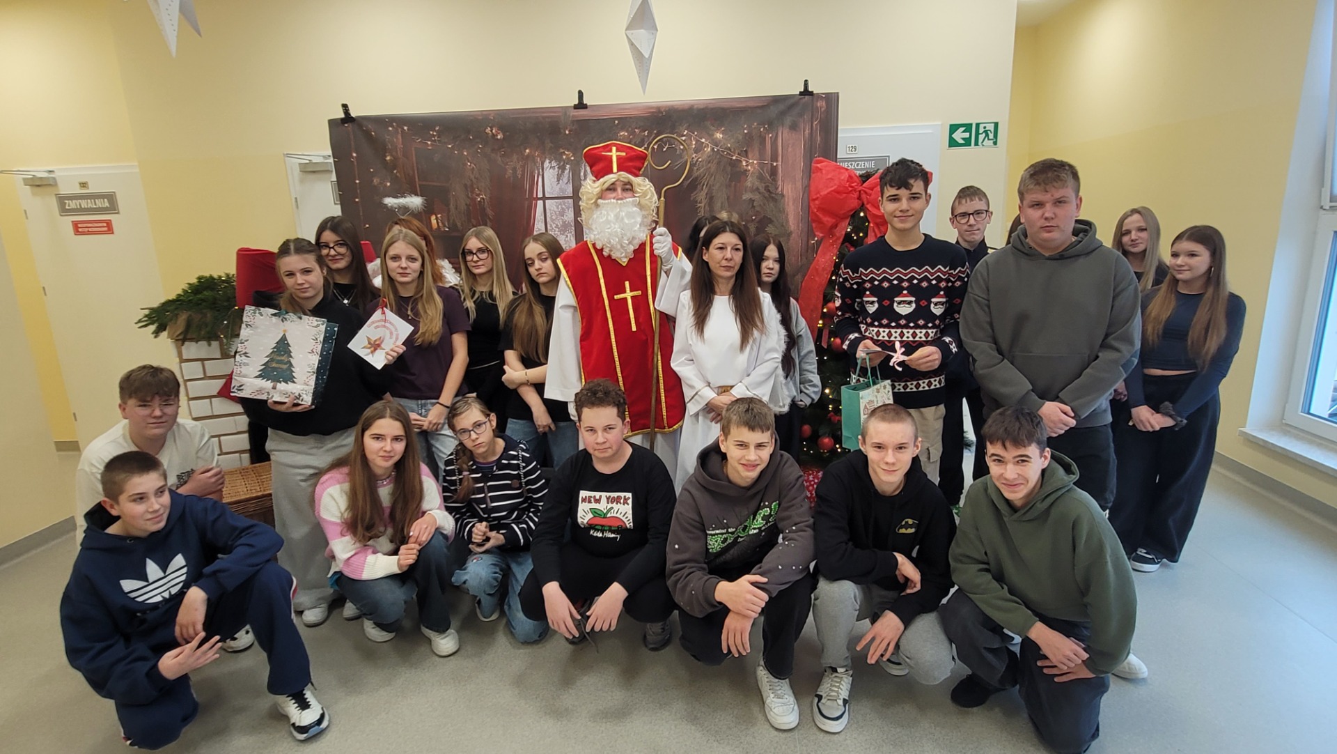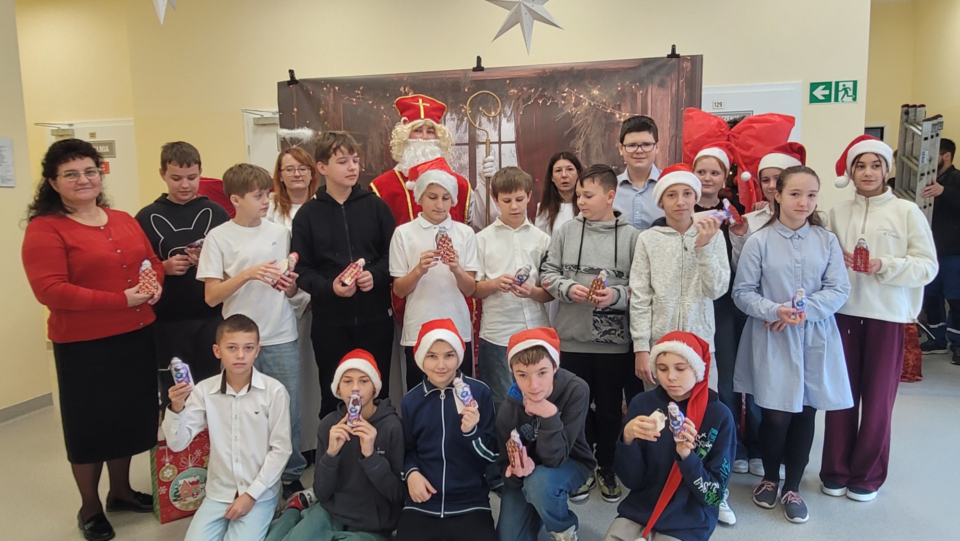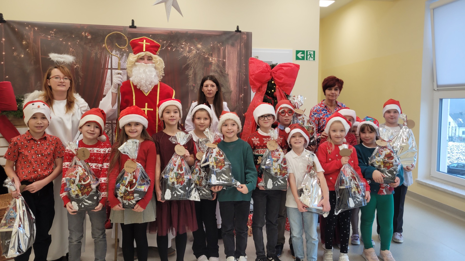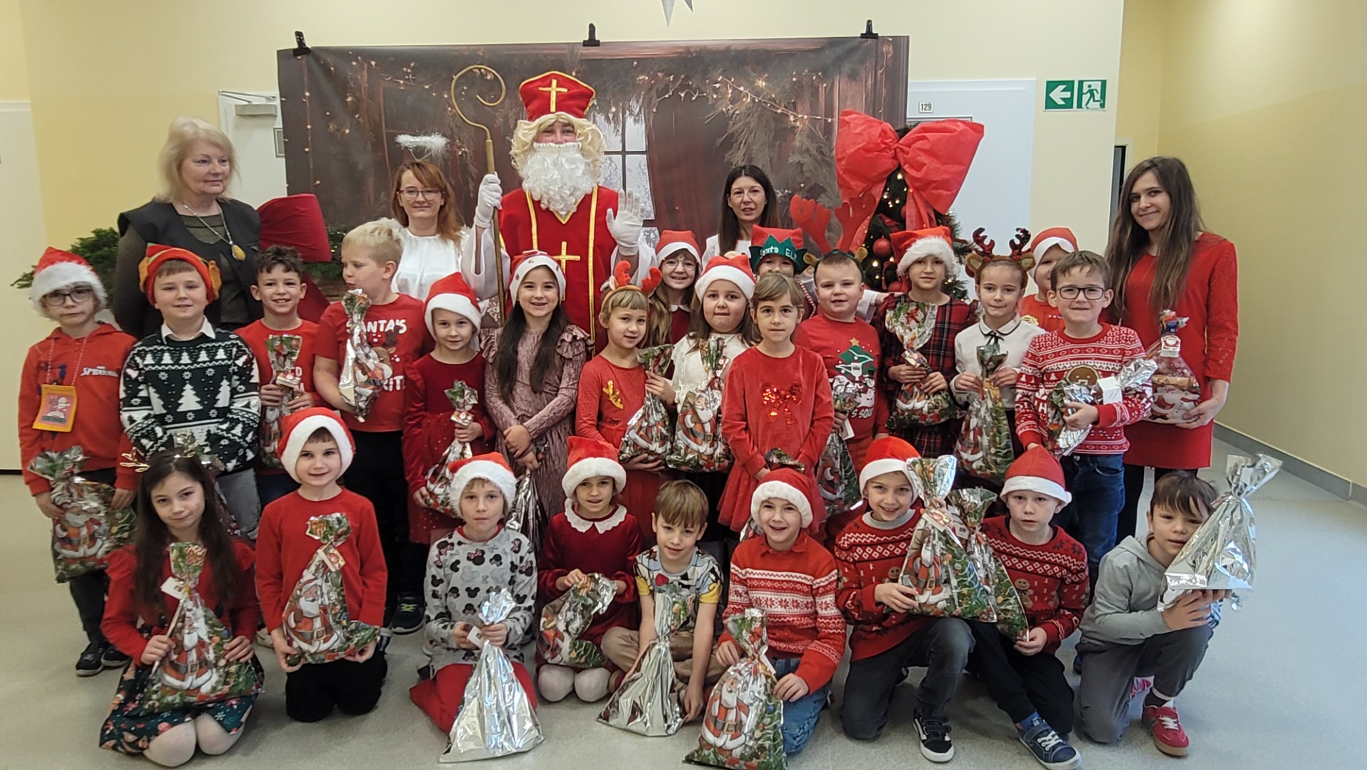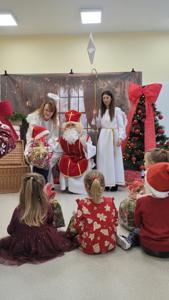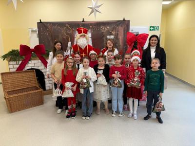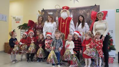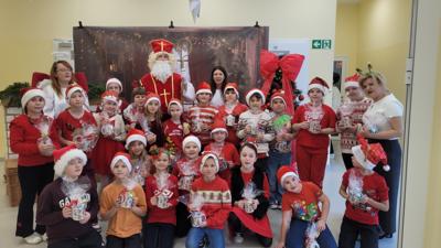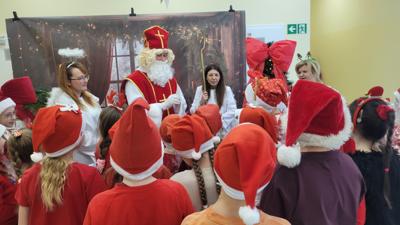 Piątek 5 grudnia to bardzo wyjątkowy dzień w naszej szkole. A wszystko to za sprawą Gościa, na którego przybycie czekaliśmy cały rok. Oczywiście mowa o Św. Mikołaju biskupie. Oczywiście i w tym roku nie ominął naszej szkoły. Swoje sanie z prezentami "zaparkowały" tym razem na przewiązce korytarza w części przedszkola. Z tego miejsca Św. Mikołaj miał najbliżej na spotkanie z dziećmi i uczniami szkoły. Anioły - pomocnicy Św. Mikołaja - zapraszały uczniów z poszczególnych klas na spotkanie z Gościem z Nieba. Oj, co było radości i niespodzianek! I tym razem nie zabrakło pięknych piosenek, wierszyków podarków dla Świętego, które przygotowaliśmy w dowód wdzięczności. Oczywiście najważniejsze były wskazówki, które zostawił nam Biskup, byśmy naśladowali Go w naszym dziecięcym i młodzieżowym okresie życia. Św. Mikołaj nie zapomniał również o wszystkich pracownikach szkoły, którym przekazał drobne słodkości. Po spotkaniu ze Św. Mikołajem każda z klas przeszła na warsztaty ozdabiania pierniczków, które na sali gimnastycznej prowadziły Panie z KGW Witanowice.