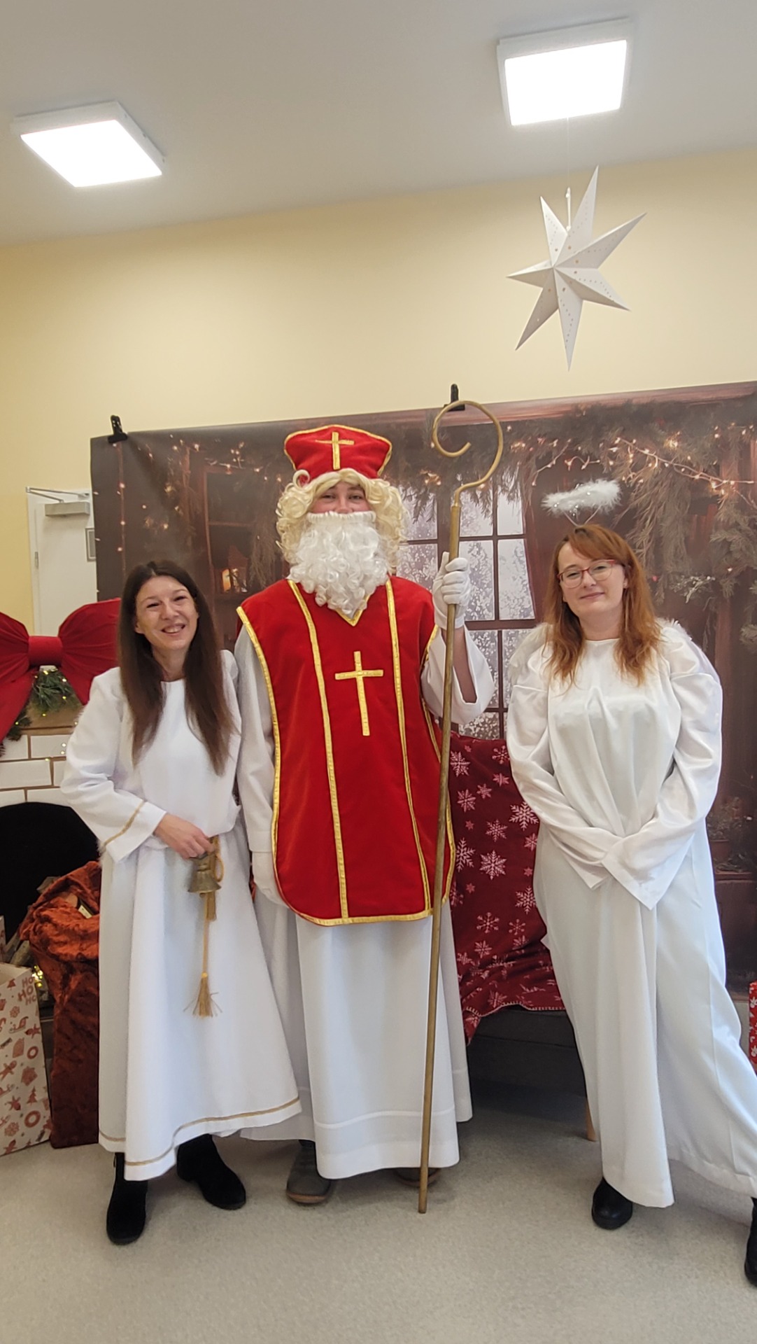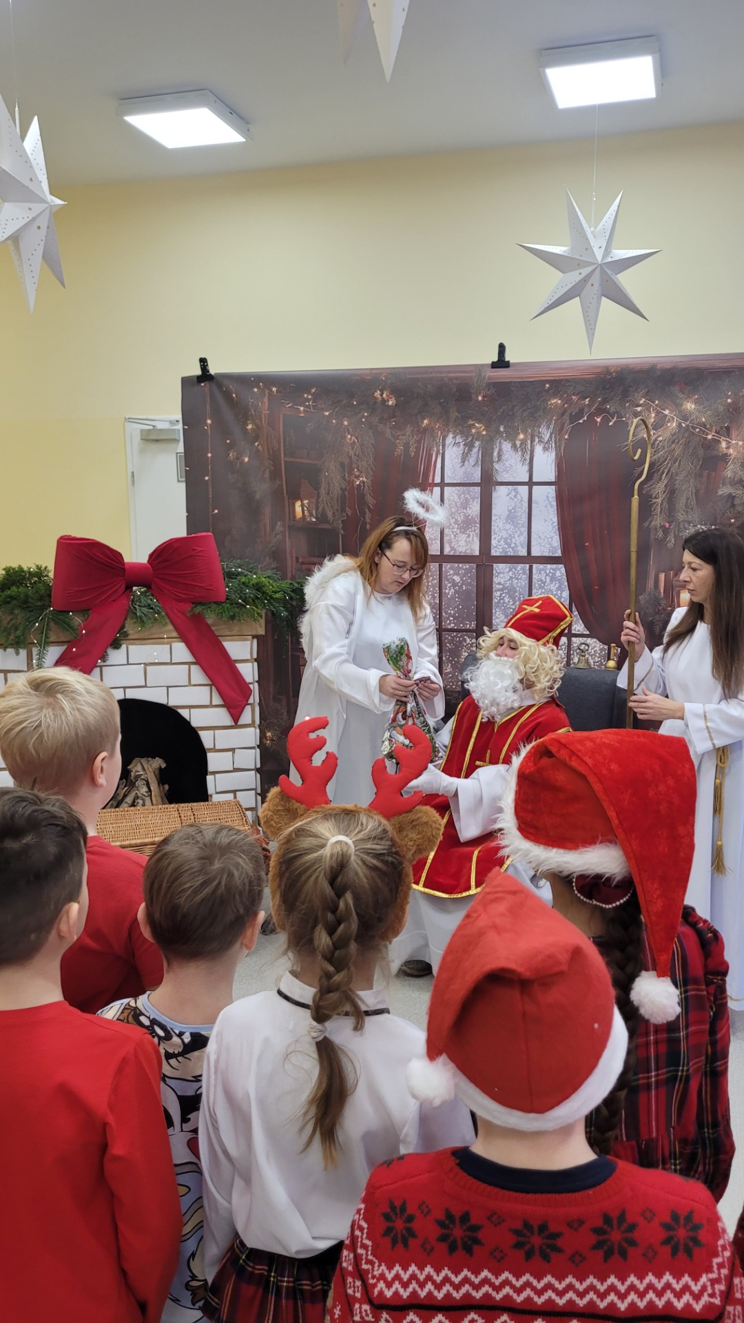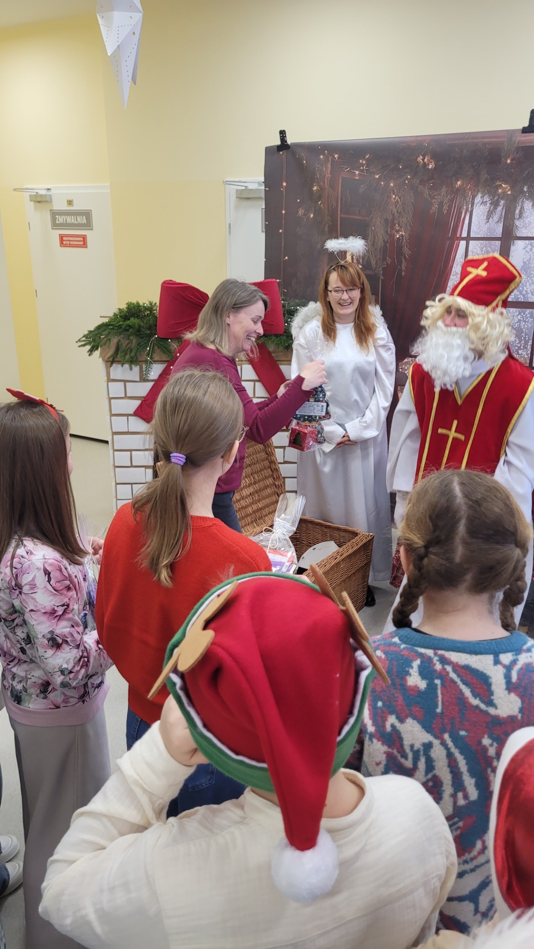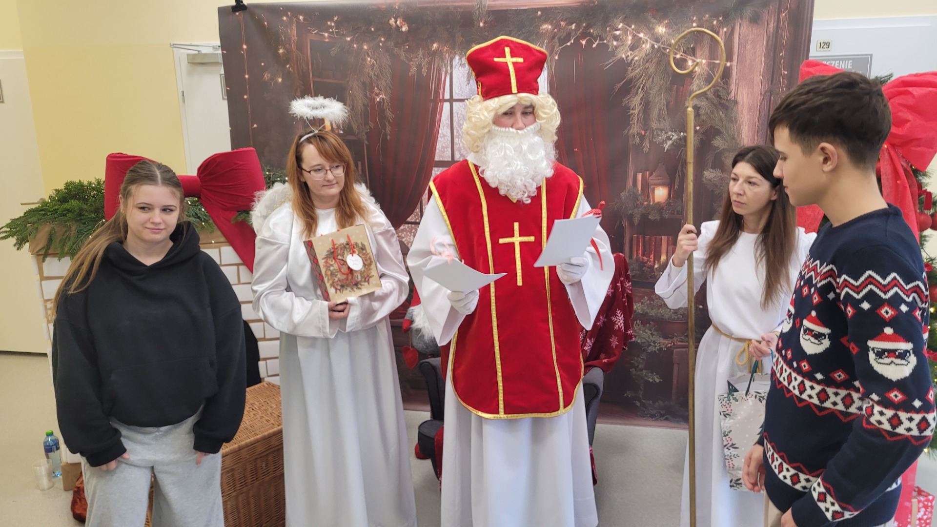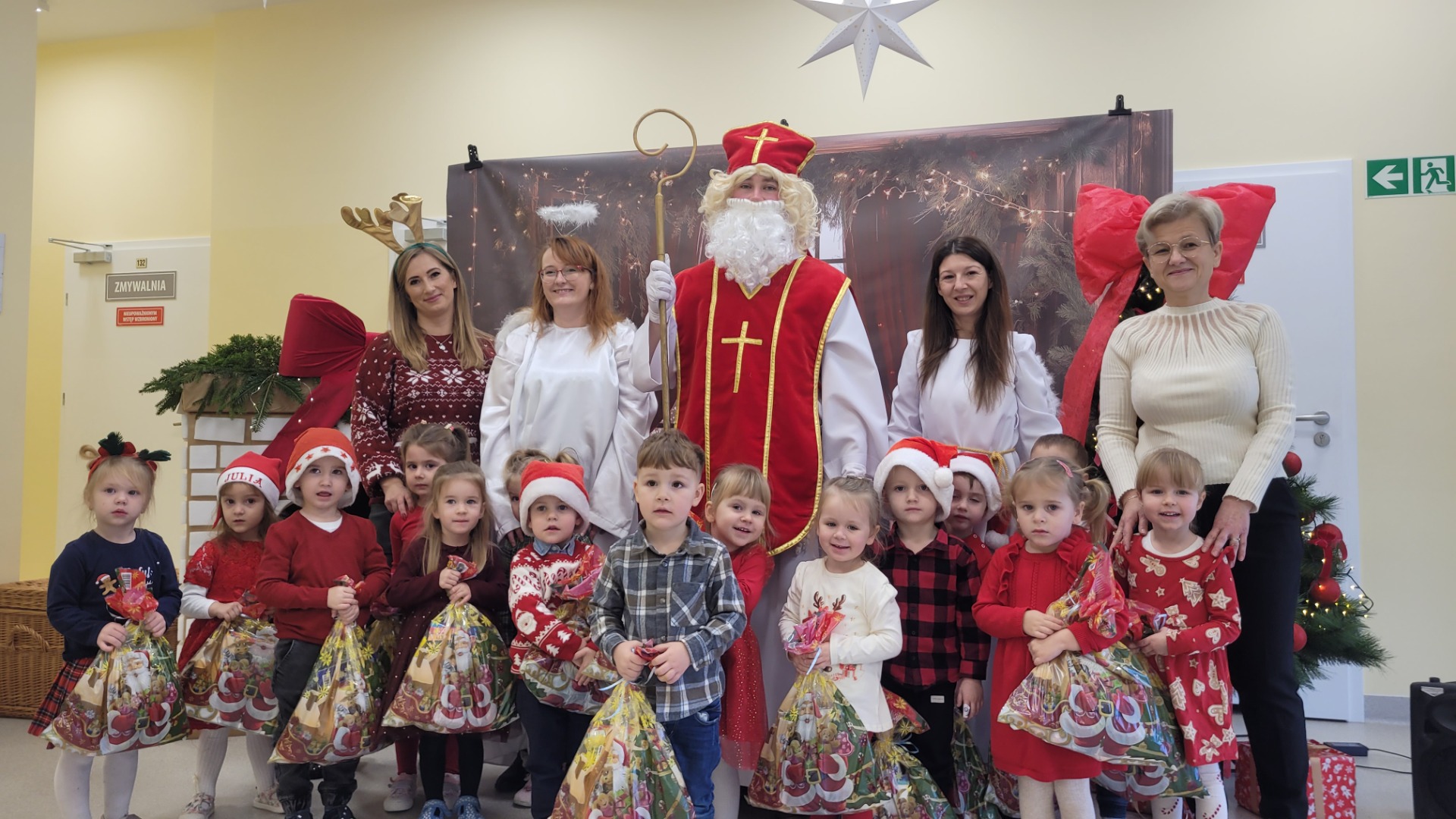 Piątek 5 grudnia to bardzo wyjątkowy dzień w naszej szkole. A wszystko to za sprawą Gościa, na którego przybycie czekaliśmy cały rok. Oczywiście mowa o Św. Mikołaju biskupie. Oczywiście i w tym roku nie ominął naszej szkoły. Swoje sanie z prezentami "zaparkowały" tym razem na przewiązce korytarza w części przedszkola. Z tego miejsca Św. Mikołaj miał najbliżej na spotkanie z dziećmi i uczniami szkoły. Anioły - pomocnicy Św. Mikołaja - zapraszały uczniów z poszczególnych klas na spotkanie z Gościem z Nieba. Oj, co było radości i niespodzianek! I tym razem nie zabrakło pięknych piosenek, wierszyków podarków dla Świętego, które przygotowaliśmy w dowód wdzięczności. Oczywiście najważniejsze były wskazówki, które zostawił nam Biskup, byśmy naśladowali Go w naszym dziecięcym i młodzieżowym okresie życia. Św. Mikołaj nie zapomniał również o wszystkich pracownikach szkoły, którym przekazał drobne słodkości. Po spotkaniu ze Św. Mikołajem każda z klas przeszła na warsztaty ozdabiania pierniczków, które na sali gimnastycznej prowadziły Panie z KGW Witanowice.