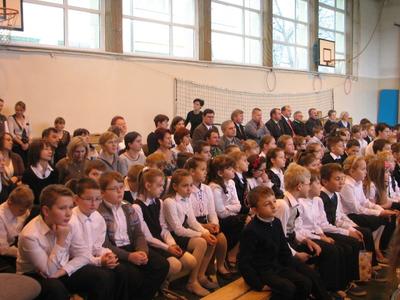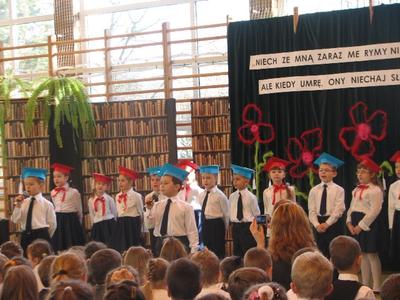 Następnie głos oddano klasie V, która wystąpiła z programem słowno- muzycznym pt. „Księgi Mistrza Jana”. Program ukazywał jak olbrzymie jest bogactwo twórczości Jana Kochanowskiego. Pieśni, fraszki, psalmy, treny to utwory, których wymowa jest ponad czasowa.Po części oficjalnej uroczystości nastąpił moment „otrzęsin uczniów klasy IV”.
