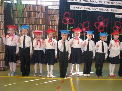 Uroczystość rozpoczęli uczniowie klasy pierwszej z programem artystycznym pt. „Jesteśmy już uczniami klasy I”. Występ wszystkim zebranym bardzo się podobał. Dzieci śpiewały i recytowały wiersze. Następnie pierwszaki wraz przedstawicielem rodziców złożyli uroczyste ślubowanie, po którym pan Dyrektor pasował wszystkie dzieci na uczniów Szkoły Podstawowej w Witanowicach. Pierwszaki na pamiątkę otrzymały kolorowe dyplomy, od rodziców olbrzymie ołówki, a od kolegów z klasy II – kolorowe pisaki. Do ślubowania klasę I przygotowywała pani wychowawczyni Barbara Jasińska.