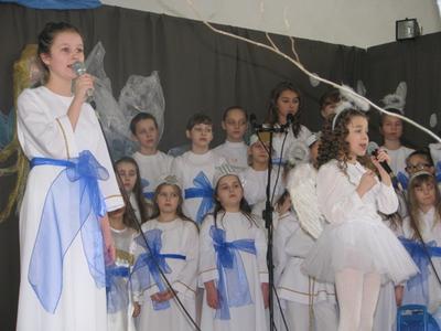Pięknie wyglądała udekorowana sala i scena, na której odbyły się nasze aktorskie popisy. W programie były „Anielskie jasełka”, w czasie których kolędowały nasze szkolne „Karmelki”. Przedstawienie zakończyły „Marzenia Dyzia” – krótki występ zawierający wiele serdecznych słów skierowanych wyłącznie do naszych Kochanych Seniorów. Mamy nadzieję, że nasze występy wszystkim się podobały, bo my bardzo się staraliśmy.