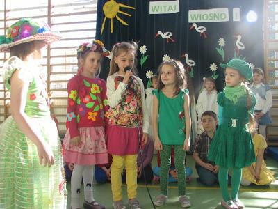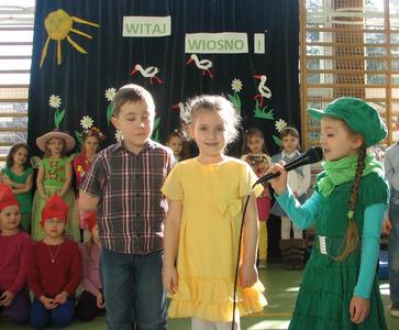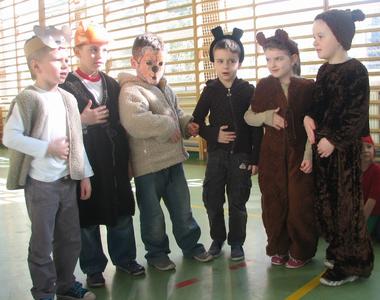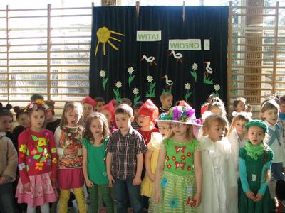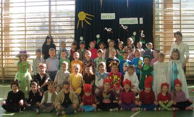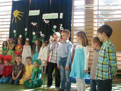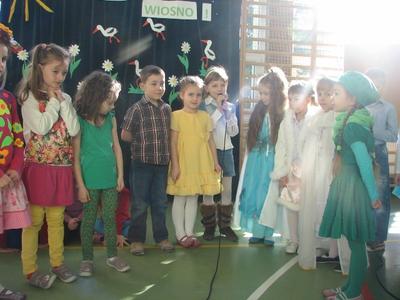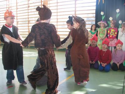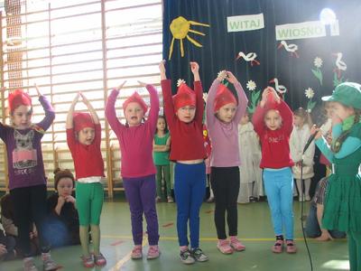 Na powitanie Wiosny w piątek 21 marca dzieci z grup 5 i 6-latków przedstawiły dla uczniów z całej szkoły inscenizację pt. "Bajka o zielonym Kapturku", przygotowaną pod czujnym okiem wychowawczyń p. Lidii i p. Barbary. Rodzice przygotowali wspaniałe stroje, a dzieci nauczyły się tekstów i piosenek. Dzieci przebrane za Zielonego Kapturka, mamę i tatę, Panią Zimę, Panią Wiosnę, niedźwiadki, krasnale i miesiące odegrały na scenie wspaniale swoje role. Przedstawienie było uzupełnione znanymi piosenkami takimi jak "Stary niedźwiedź" i "Krasnoludki". Na zakończenie zaśpiewali piosenkę o Wiośnie. Całe przedstawienie było bardzo barwne, co można zobaczyć na niżej zamieszczonych zdjęciach.