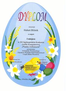 Uczniowie naszej szkoły po raz pierwszy brali udział w XII OGÓLNOPOLSKIM KONKURSIE GRAFIKI KOMPUTEROWEJ "Pisanka wielkanocna." Opiekunem merytorycznym konkursu była Akademia Sztuk Pięknych we Wrocławiu. Konkurs przebiegał pod patronatem Arcybiskupa Metropolity Wrocławskiego oraz Dyrektora Wydziału Szkół Podstawowych i Specjalnych Urzędu Miasta Wrocławia. Konkurs organizowany był przez Terapeutyczną Szkołę Podstawową nr 119 oraz Europejskie Stowarzyszenie Miłośników Nauki i Kultury PROGRESSIO we Wrocławiu dla dzieci z Polski do lat 13. Celem konkursu było propagowanie wśród dzieci grafiki komputerowej, jako nowego środka wyrazu w twórczości artystycznej oraz tradycji chrześcijańskich, wypływających ze źródła Wielkiej Nocy, kształcenie wrażliwości estetycznej oraz wykorzystanie własnej wyobraźni i oryginalności pomysłów.