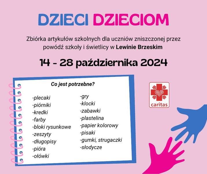 18 października 2024 Aktualności Pomóżmy dzieciom z Lewina Brzeskiego Szkolne Koło Caritas serdecznie zachęca do udziału w akcji charytatywnej "Dzieci Dzieciom", która będzie trwać do czwartku 24 października. Polega ona na zebraniu wskazanych na plakacie materiałów... Czytaj więcej