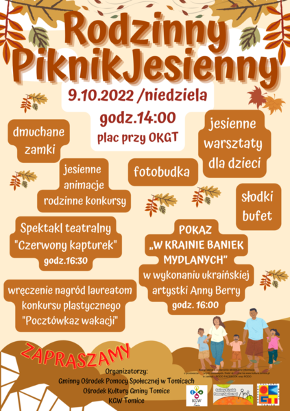 20 września 2022 Aktualności Rodzinny Piknik Jesienny Piknik odbędzie się 9 października br. o godz. 14:00 na placu przy Ośrodku Kultury a organizatorem pikniku jest GOPS Tomice, OKGT oraz KGW Tomice. W trakcie pikniku nastąpi wręczenie nagród... Czytaj więcej